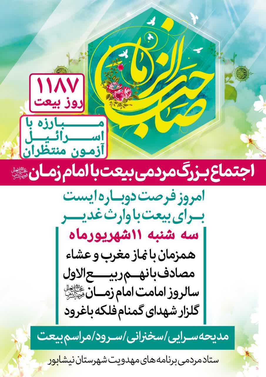 به گزارش روابطعمومی بنیاد فرهنگی حضرت مهدی موعود عجل الله تعالی فرجه الشریف استان خراسان رضوی، اجتماع بزرگ مردمی بیعت با امام زمان(عج) نیشابور روز سه شنبه یازدهم شهریور همزمان با نماز مغرب و عشاء با حضور سه هزار نفر از مردم برگزار شد.