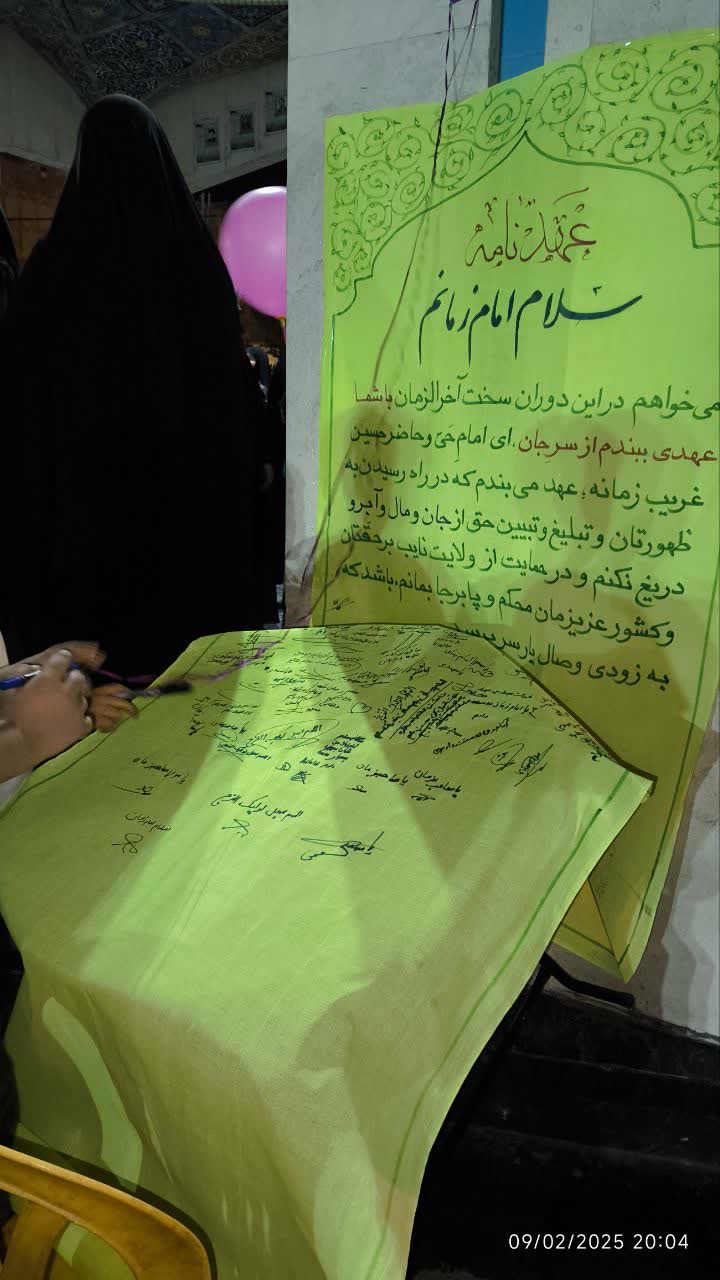 همچنین اجرای گروه سرود نوای مهدوی بنیاد نیشابور زینت بخش این مراسم شد و قرائت بیعت نامه و نوشتن عهد توسط مردم بر مشارکت آنها افزود و همچنین از نفر سوم کنکور انسانی، سارا ذبیحی که از خانواده مهدی یاوران بنیاد شهرستان نیشابور است تجلیل شد.